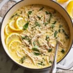 Avgolemono is a traditional Greek egg and lemon soup known for its creamy texture and bright, tangy flavor. Made with tender chicken thighs, aromatic broth, tender orzo pasta, and a luscious mixture of eggs and lemon juice, this comforting soup is perfect for any season and brings a taste of Greece to your table.