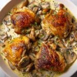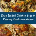 Delicious baked chicken legs smothered in a creamy mushroom sauce, seasoned with garlic, onion, and thyme for a comforting and easy dinner that serves six.