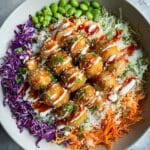 This Bang Bang Chicken Bowl combines crispy fried chicken bites coated in crunchy panko breadcrumbs with a creamy, spicy Bang Bang sauce. Served over a bed of rice and fresh vegetables like shredded cabbage, carrot, and edamame, it’s a vibrant and flavorful meal perfect for a satisfying lunch or dinner.