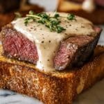 Now comes the best part! Place one slice of the cooked beef tenderloin atop each crispy crostini. Then, spoon a generous amount of the warm Parmesan cream sauce over the beef. For a final touch, sprinkle fresh thyme leaves on top if you have them—this adds a burst of herbal freshness that cuts through the rich sauce beautifully. Serve these elegant bites immediately and watch everyone savor each mouthwatering piece.