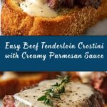 Beef Tenderloin Crostini with Parmesan Cream Sauce is an elegant appetizer featuring tender slices of beef atop crisp baguette crostini, finished with a rich and creamy Parmesan sauce. Perfect for entertaining, these bite-sized treats combine the savory flavors of perfectly seared beef with a luxurious, garlicky cheese sauce.