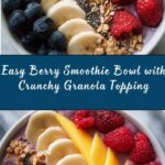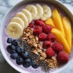 This vibrant smoothie bowl combines the refreshing taste of mixed berries and banana with crunchy granola and chia seeds for a nutritious and energizing breakfast or snack. Blended to a creamy consistency and topped with fresh fruit, it’s a delightful way to start your day.
