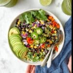 Because of the fresh vegetables and avocado, this salad does not freeze well. Freezing can change the texture and flavor negatively, so it’s recommended to enjoy it fresh or freshly prepared each time.