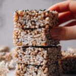Delight in these Black Sesame Rice Krispie Treats, a unique twist on the classic no-bake snack. Combining the nutty richness of black sesame paste with crispy rice cereal and sweet mini marshmallows, these Asian-inspired dessert squares are both easy to prepare and irresistibly flavorful. Topped with toasted black sesame seeds for added texture and taste, they make a perfect treat for any occasion.