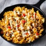 Sprinkle a generous layer of shredded Mozzarella evenly across the top of the pasta in the skillet. Place the pan under your oven’s broiler for just a couple of minutes, watching closely. The goal is to get the cheese melted, bubbly, and lightly golden without burning. Once it’s perfectly broiled, your Chicken Fajita Pasta Recipe is ready to serve and enjoy!