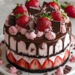 Indulge in this luscious Chocolate Covered Strawberry Ice Cream Cake, featuring moist homemade chocolate cake layers nestled with creamy strawberry ice cream and topped with a silky chocolate ganache. Garnished with fresh strawberries and chocolate shavings, this dessert is perfect for warm weather celebrations or anytime you crave a refreshingly decadent treat.