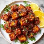 These Crispy Air Fryer Honey Garlic Salmon Bites are tender salmon cubes perfectly marinated in a flavorful blend of soy sauce, honey, garlic, ginger, and sesame oil, then air fried to golden, crispy perfection. Garnished with fresh cilantro and toasted sesame seeds, they make a delicious and healthy appetizer or snack with an irresistible sweet and savory taste.