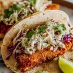 Deliciously crispy fish tacos featuring lightly battered and fried white fish fillets, topped with a fresh cabbage slaw and a creamy lime-spiced sauce. Ready in just 30 minutes, these tacos combine crunchy textures and vibrant flavors ideal for a quick and satisfying meal.