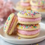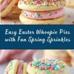 These Easter Whoopie Pies are a delightful springtime treat featuring soft vanilla cake cookies studded and coated with colorful Easter sprinkles, sandwiched with a creamy pink vanilla frosting. Perfect for festive celebrations, they combine a fun and vibrant look with a deliciously tender texture and sweet, smooth filling.