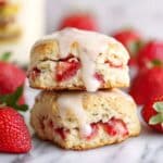 Enjoy these fresh strawberry biscuits bursting with juicy diced strawberries and layered flaky texture. Perfectly tender and golden-baked, they are topped with a luscious strawberry-vanilla glaze for a delightful sweet treat ideal for breakfast or brunch.