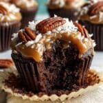 Delight in these rich and moist German Chocolate Cupcakes, featuring a tender chocolate base loaded with shredded coconut and pecans, topped with a luscious homemade coconut-pecan frosting that’s buttery, sweet, and perfectly nutty.
