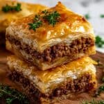 Serving your Greek Phyllo Meat Pie with a sprinkle of fresh parsley or a few crumbled feta cheese pieces adds a lovely fresh and tangy contrast. A drizzle of extra virgin olive oil over each slice just before serving can enhance the rich flavors and provide a luscious finish.
