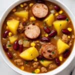 This hearty Cowboy Stew is a flavorful, comforting dish perfect for satisfying large appetites. Packed with a rich combination of bacon, kielbasa sausage, lean ground beef, potatoes, beans, and vegetables, it simmers together in a savory beef broth with spices to create a robust and filling meal that is great for weeknight dinners or casual gatherings.