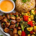 - Combine and Serve: Return the cooked chicken and vegetables to the pan with the fried rice. Toss everything together to combine and heat through. Serve the hibachi chicken and veggies with fried rice hot, accompanied by yum yum sauce or extra soy sauce if desired.