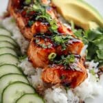A flavorful and vibrant Honey Garlic Salmon Rice Bowl featuring tender cubes of salmon glazed in a sweet and spicy honey garlic sauce, served atop fluffy coconut-infused basmati rice with a refreshing cucumber avocado salad. This quick and easy recipe is perfect for a wholesome weeknight dinner packed with bright flavors and textures.