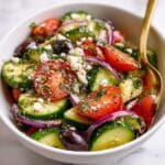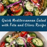 A refreshing and vibrant Mediterranean Salad combining crisp cucumbers, ripe tomatoes, kalamata olives, fresh herbs, and creamy feta cheese, all tossed in a simple olive oil and red wine vinegar dressing. Perfect for a quick, healthy side or light meal.