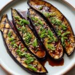 - Garnish and Serve: Remove the eggplants from the oven and sprinkle with toasted sesame seeds and thinly sliced green onion for an aromatic, flavorful finish. Serve warm as a side dish.