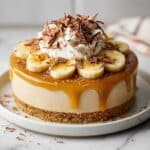 This no bake vegan banoffee cheesecake combines a crunchy biscuit base with a creamy, caramelized banana and cashew filling, topped with luscious vegan caramel, fresh banana slices, and whipped coconut cream. It’s a rich, indulgent dessert perfect for vegan and dairy-free diets, requiring no baking and deliciously simple to prepare.