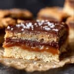 11. Serve: Let the blondies cool completely before lifting them out using the parchment overhang and cutting them into 9 squares. Enjoy the gooey, Nutella-stuffed, salted caramel-topped blondies!