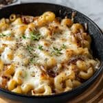 A cozy, comforting one-pot French Onion Pasta featuring caramelized onions, savory beef broth, and melted Gruyère and Parmesan cheeses. This easy-to-make dish combines classic French onion soup flavors with hearty pasta for a delicious and satisfying meal in just 45 minutes.