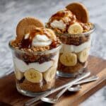 Delight in these creamy and decadent Peanut Butter Banana Cream Pie Jars, featuring layers of a graham cracker crust, smooth peanut butter pudding, fresh banana slices, and fluffy whipped cream. Perfect for a no-bake, easy-to-assemble dessert that’s ideal for any occasion.