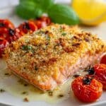 Slide the baking sheet into the preheated oven and let the magic happen for 12 to 15 minutes. The crust should turn a gorgeous golden brown while the salmon becomes flaky and tender. To be precise, the internal temperature should reach 145°F (63°C) if you want to use a thermometer.