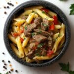 A delicious and creamy Philly Cheese Steak Pasta combining tender seared flank steak, sautéed onions and peppers, and a rich provolone cheese sauce tossed with pasta. This dish brings the iconic flavors of a Philly cheesesteak sandwich into a comforting pasta meal, perfect for weeknight dinners.