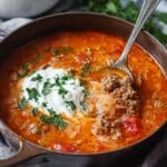 This hearty Polish Stuffed Cabbage Soup captures the traditional flavors of stuffed cabbage rolls in a comforting, warming bowl. Ground beef, cabbage, rice, and a rich tomato and beef broth come together with subtle spices to create a delicious, easy-to-make soup that simmers to tender perfection in under an hour.
