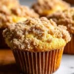 When you’re ready to eat, rewarm the muffins in a 325°F (160°C) oven for about 10 minutes to regain that freshly-baked warmth and crispiness on top. You can also microwave them for about 15-20 seconds, but the oven method keeps the streusel crunchier.
