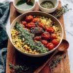 This Roast Cherry Tomato and Thyme Risotto with Basil Pesto is a creamy and flavorful Italian main course featuring blistered cherry tomatoes, aromatic thyme, and a fresh basil pesto finish. The Arborio rice is cooked slowly on the stovetop, absorbing warm vegetable broth and white wine, resulting in a rich and comforting dish perfect for a vegetarian dinner.