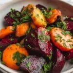 This vibrant Roasted Beets and Carrots recipe features tender, naturally sweet roasted root vegetables drizzled with a tangy maple vinaigrette. Perfect as a flavorful side dish, this recipe highlights the caramelized notes of roasted beets and carrots enhanced by a simple but delicious dressing made with maple syrup, Dijon mustard, and Champagne vinegar. Garnished with fresh parsley, it’s a wholesome, colorful addition to any meal.