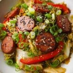 A quick and flavorful Sausage and Cabbage Stir Fry that combines smoky sausage with crisp cabbage, red bell pepper, and aromatic seasonings for a delicious and easy meal ready in just 35 minutes.