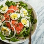 This Smoked Salmon Salad with Creamy Caper Chive Dressing is a refreshing and nutritious meal perfect for a light lunch or dinner. Featuring a mix of crisp greens, arugula, cherry tomatoes, and thinly sliced smoked salmon, it’s tossed in a tangy and creamy dressing made from sour cream, mayonnaise, capers, fresh chives, and lemon juice. Ready in just 15 minutes with no cooking required, this salad combines fresh flavors and healthy fats for a satisfying, gluten-free, pescatarian-friendly dish.