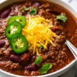 This chili freezes beautifully. Portion it out into freezer-safe containers or heavy-duty zip bags and freeze for up to 3 months. When you’re ready, simply thaw in the fridge overnight for an easy, hearty meal ready in minutes.