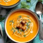 For entertaining, serve the soup in small, pretty cups or ramekins for a starter course. Swirl a drizzle of chili oil on the surface for an elegant look and a touch more spice. You can also top with a dollop of Greek yogurt or sour cream to add creaminess while creating a beautiful contrast against the orange soup.