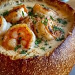 Carefully ladle the steaming hot seafood soup into your toasted bread bowls, filling them generously to the brim. The crusty bread absorbs just enough broth to stay flavorful without falling apart, turning each bite into a fun combination of creamy soup and warm, chewy bread. Don’t forget to place the bread tops alongside for dunking!