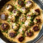 Return your beautifully browned meatballs to the skillet and nestle them into that heavenly creamy gravy. Let everything simmer together for about 5 more minutes so the meatballs soak up those luscious flavors and the whole dish comes together as one harmonious experience. Finish with a sprinkle of fresh chopped parsley to brighten it all up.