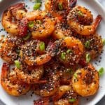 - Garnish and serve: Remove the skillet from heat. Garnish the shrimp with sesame seeds, sliced green onions, and a squeeze of fresh lime juice. Serve immediately to enjoy the vibrant flavors.