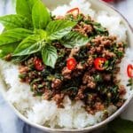 This Thai Basil Chicken recipe is a quick and flavorful stir-fry featuring ground chicken cooked with aromatic Thai bird chilies, shallots, garlic, and fragrant holy basil leaves. Perfect for a fast weeknight dinner, it combines savory, spicy, and slightly sweet flavors, served best over steamed rice for a classic Thai meal.